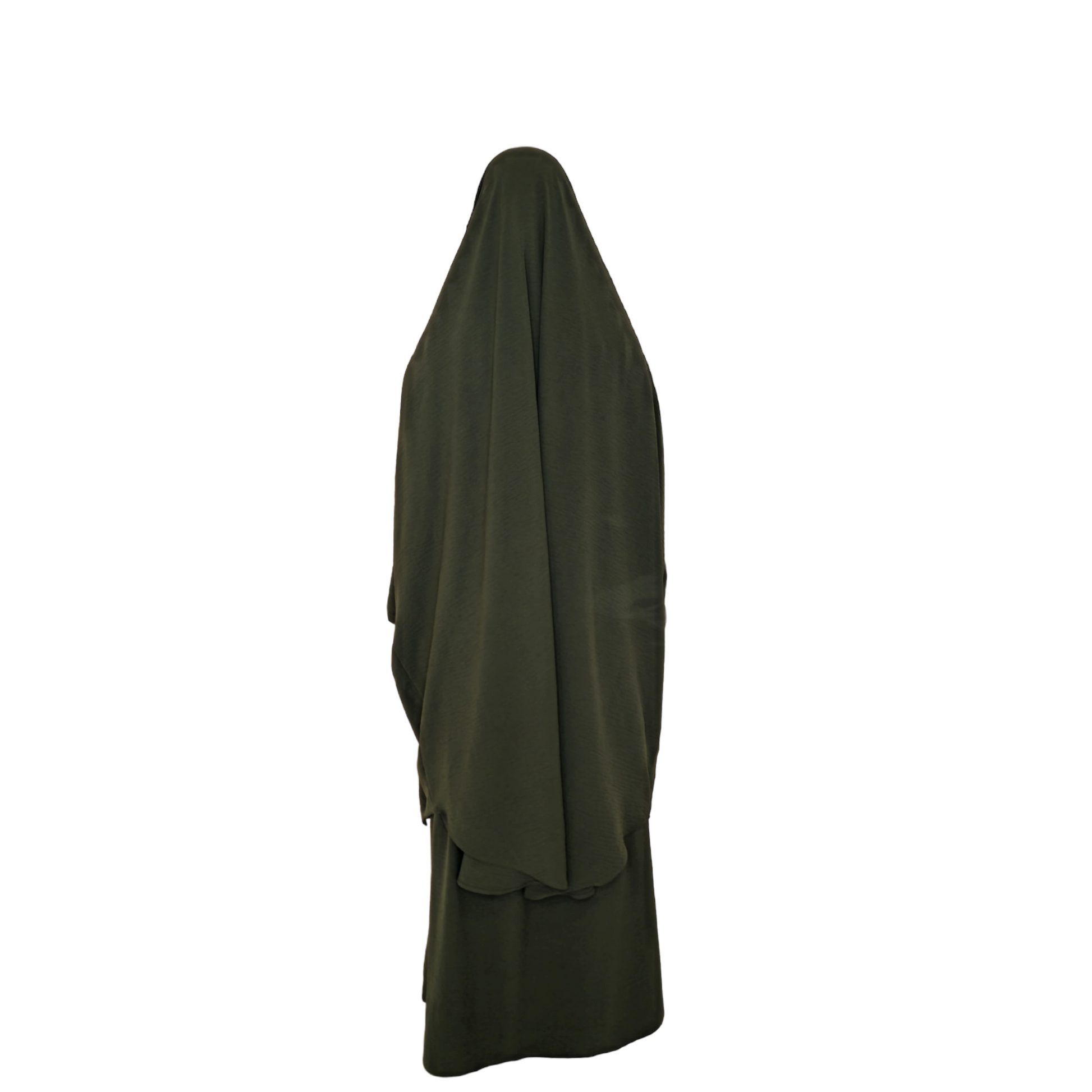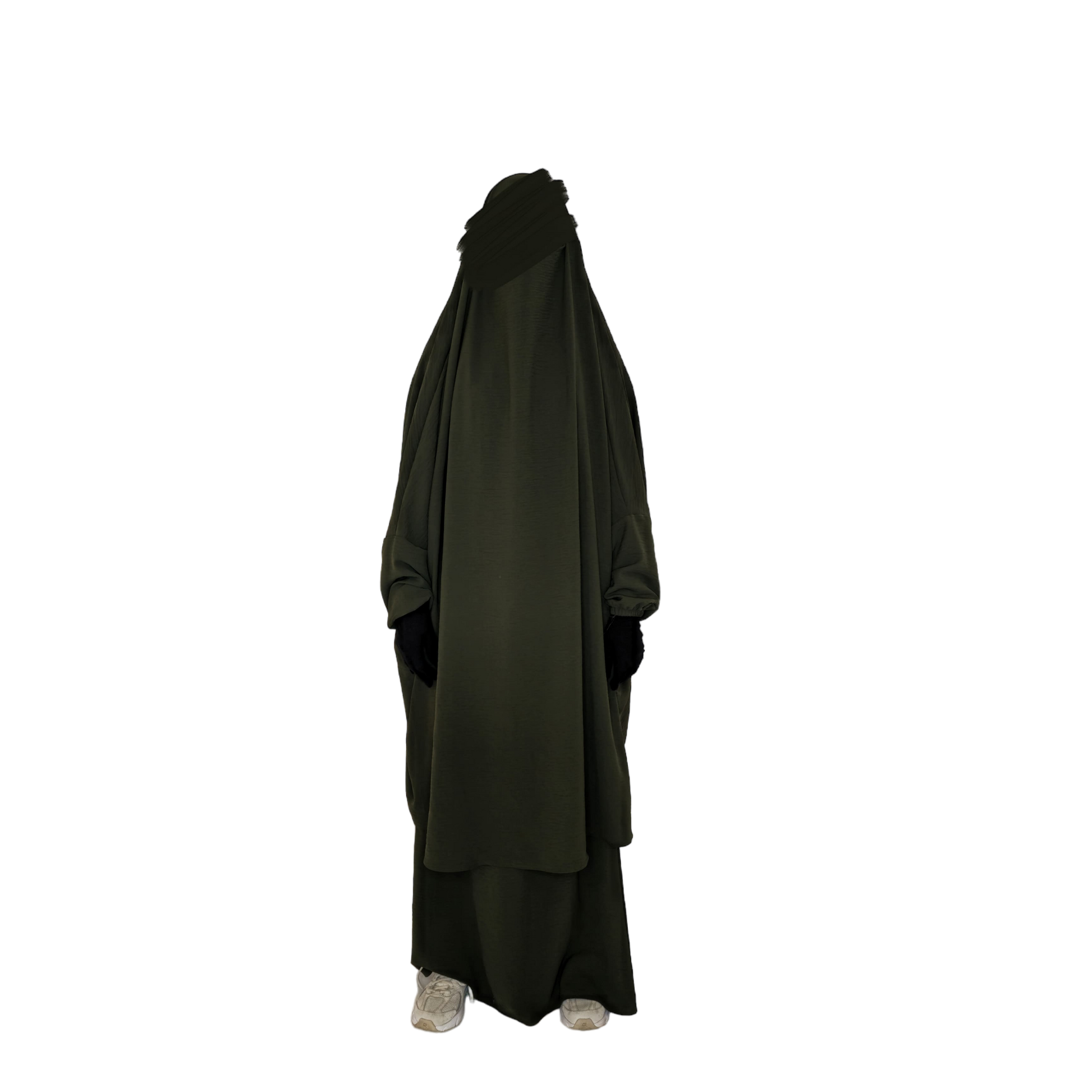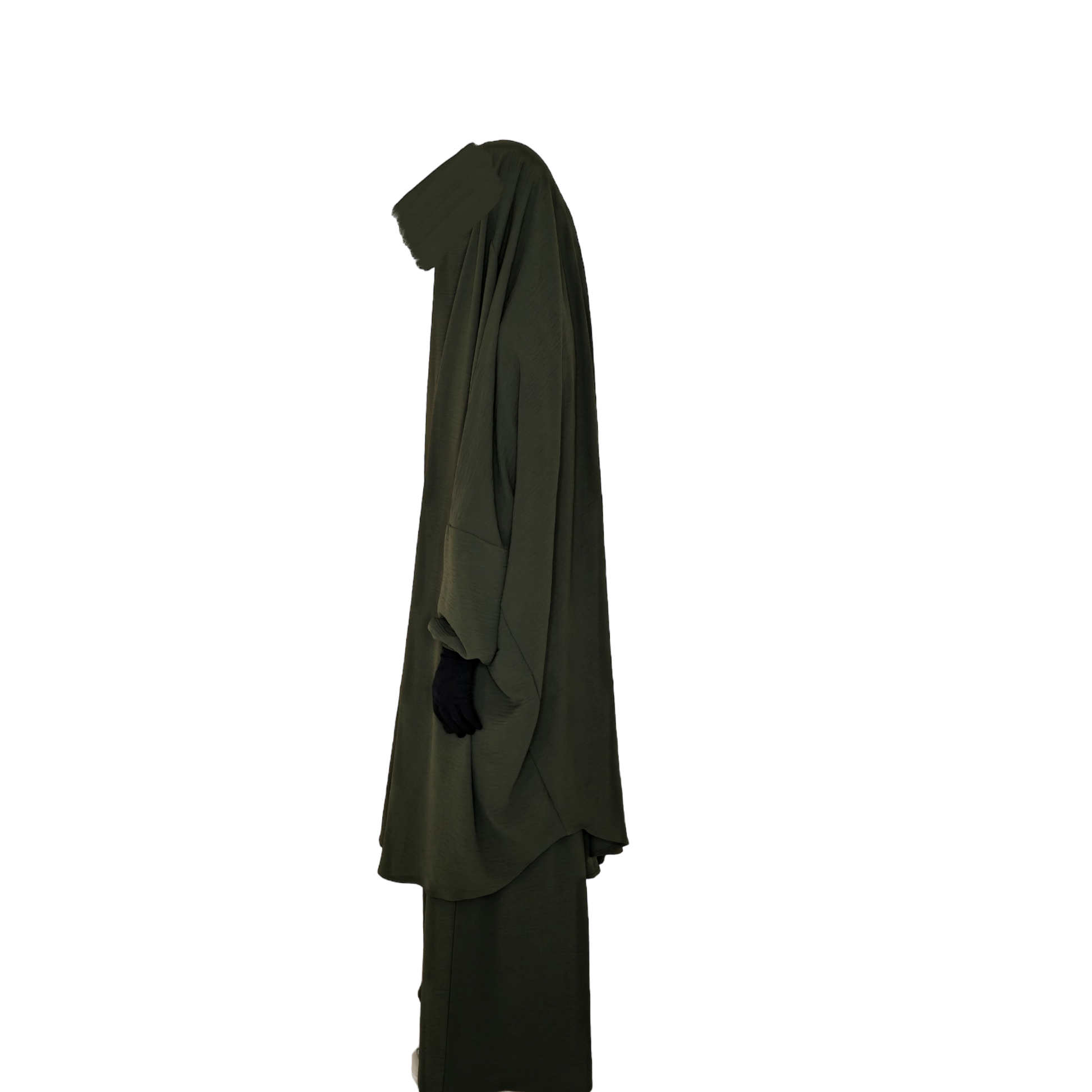 The 2 Piece Jilbab is made from the same fabric as your favourite khimar - jazz crepe! It comes with a skirt and the overhead jilbab with sleeves. Tie up strings are included for the French khimar look as well as extra strings for niqabis.