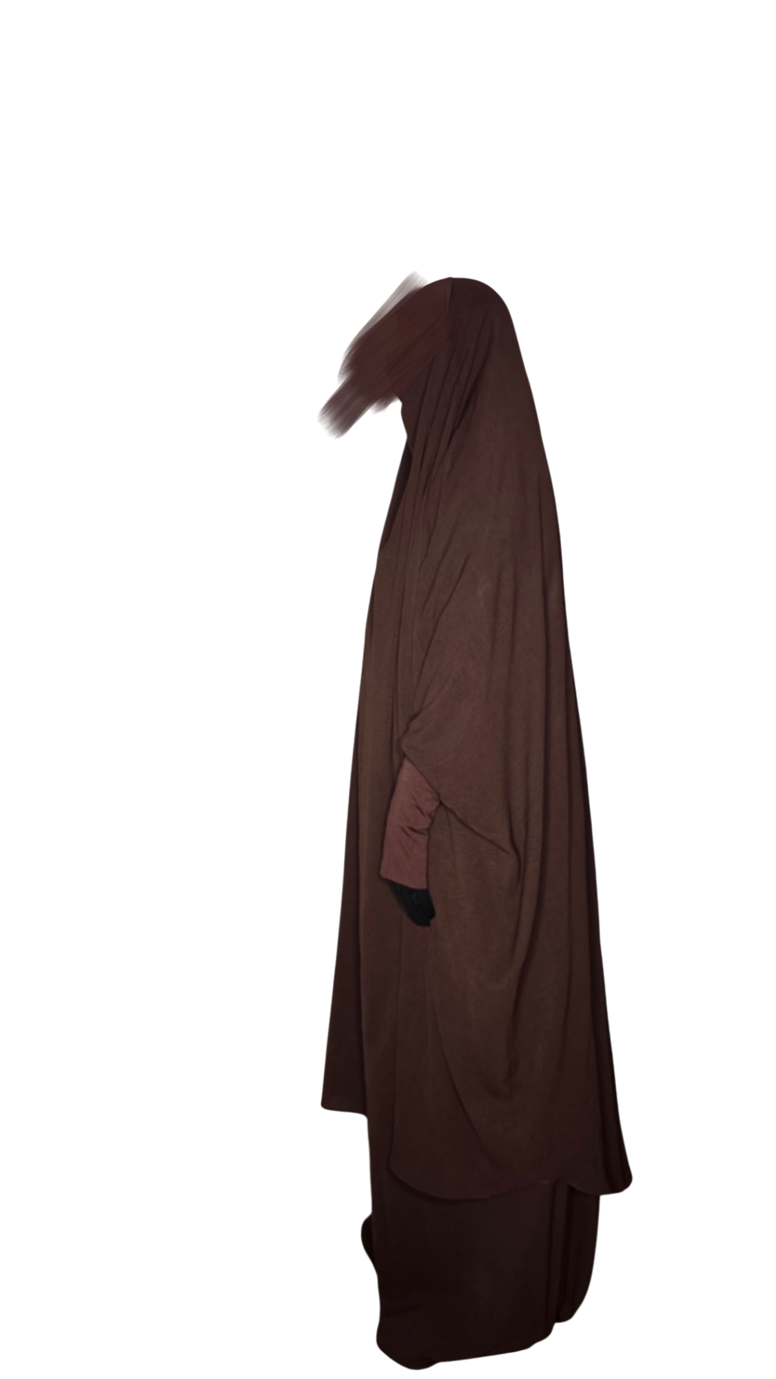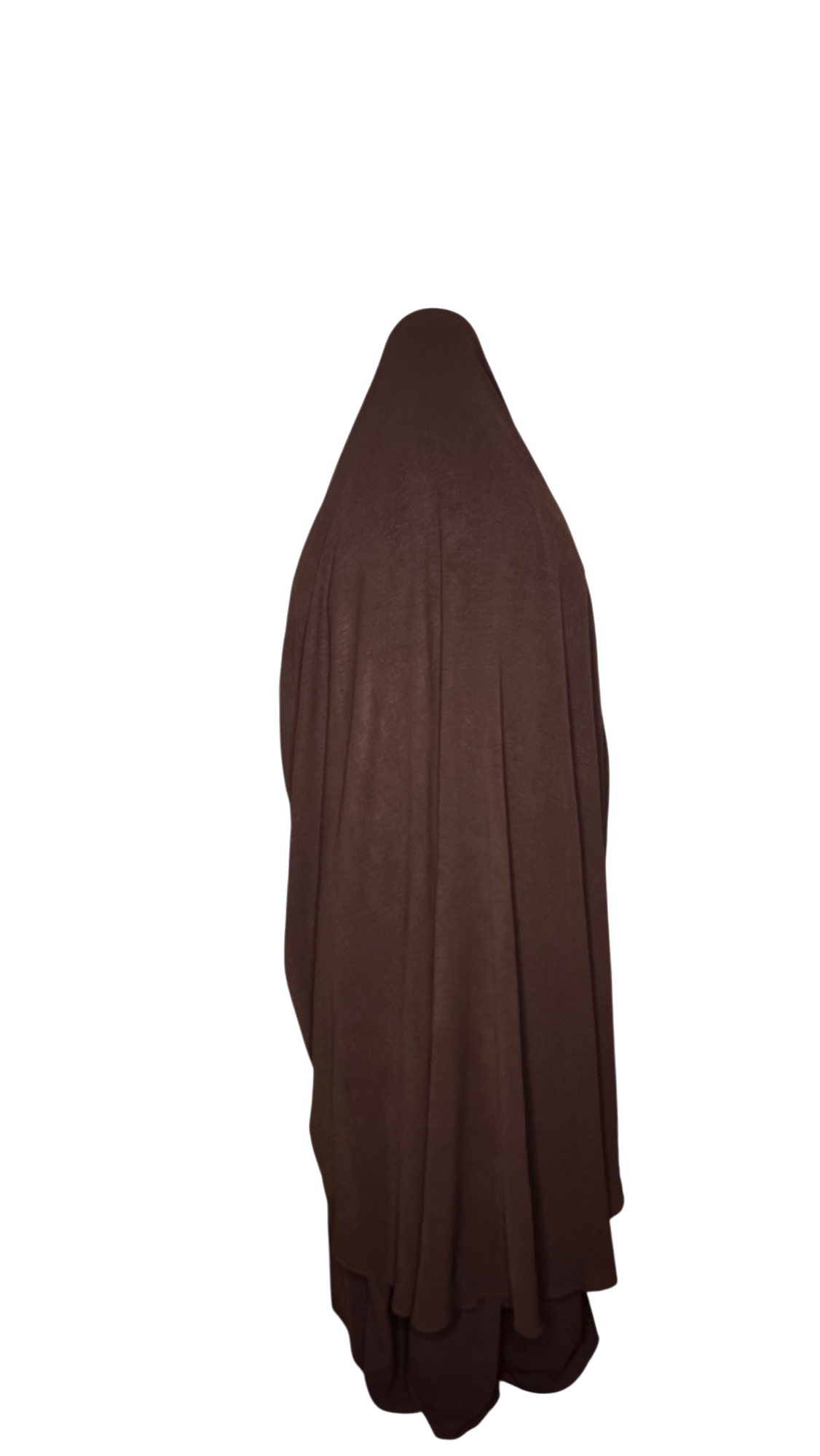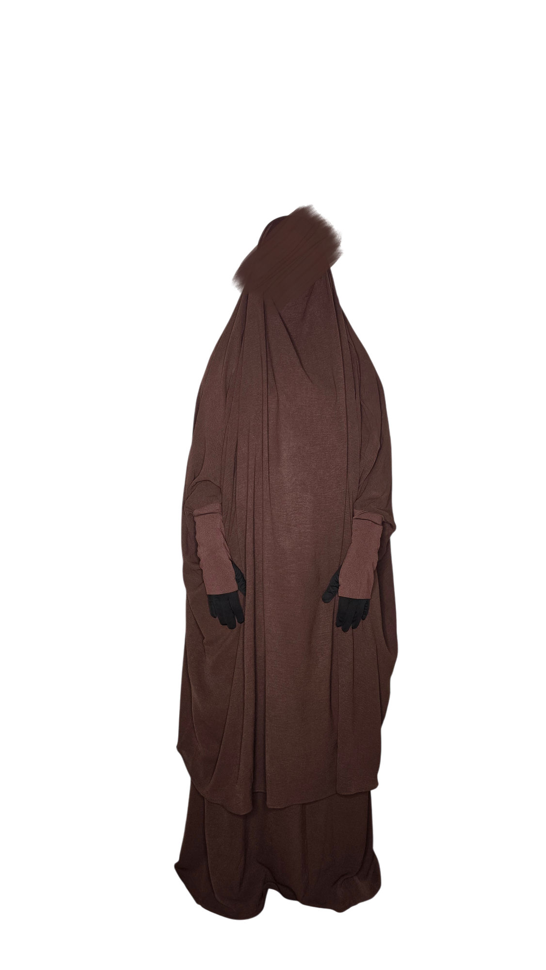 ntroducing our Crepe × Jersey Jilbab — a refined take on our classic two-piece design. Crafted with a luxurious jazz crepe body, this jilbab features custom-dyed jersey and Lycra detailing around the chin, head, and sleeves for a seamless, perfectly matched look.