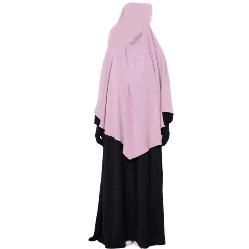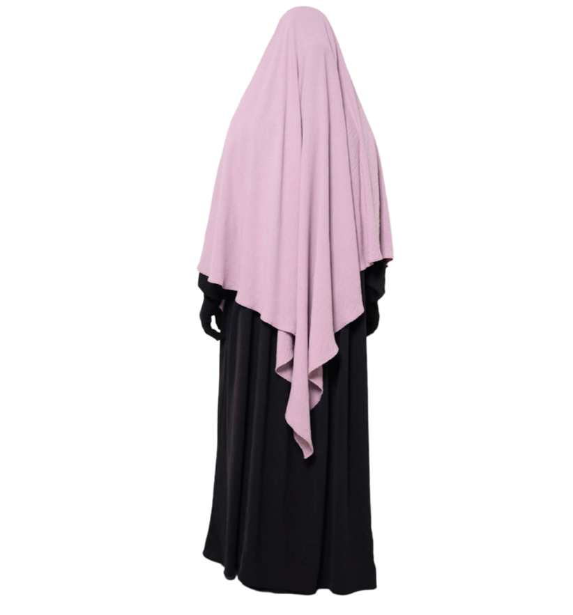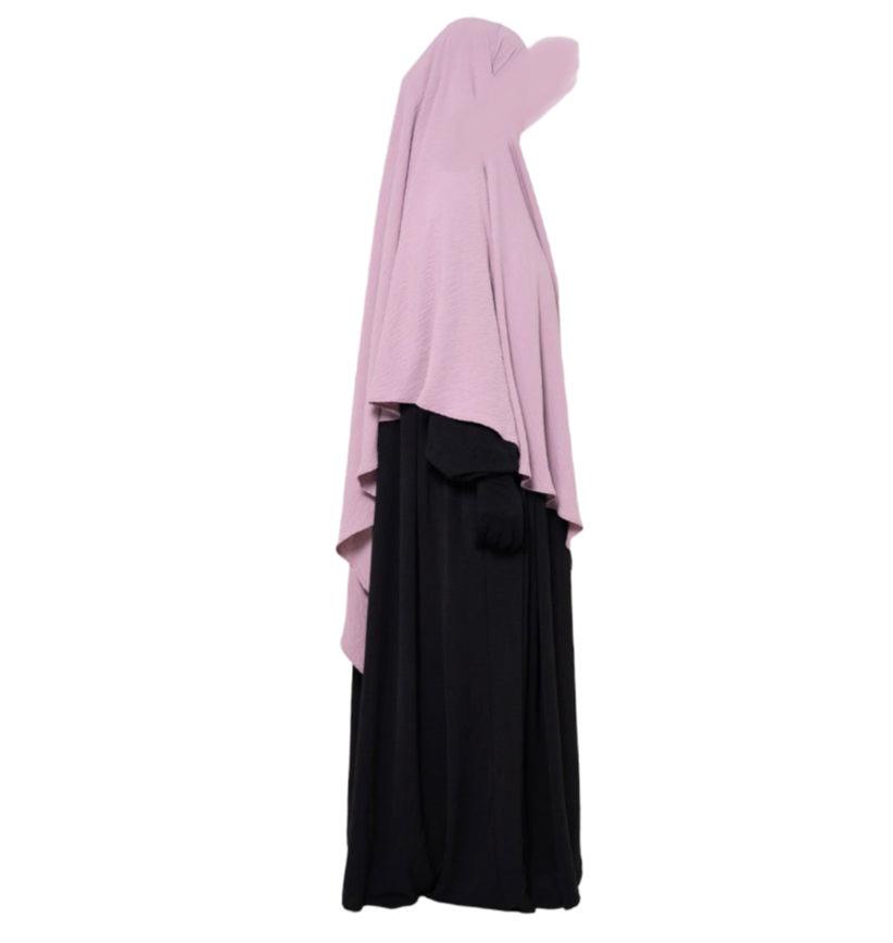 The Diamond Khimar is made from jazz crape fabric that sits comfortably around the face without slipping. It can be tied from the inside or outside, depending on what you prefer. It allows enough coverage for the front and back and is perfectly paired with the Princess Abaya.
