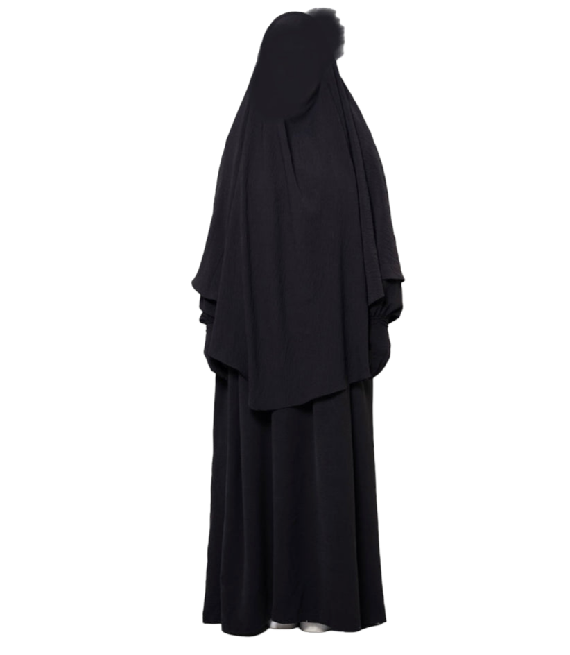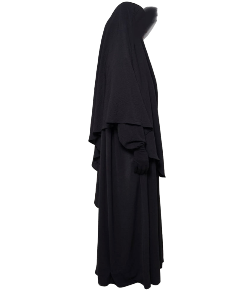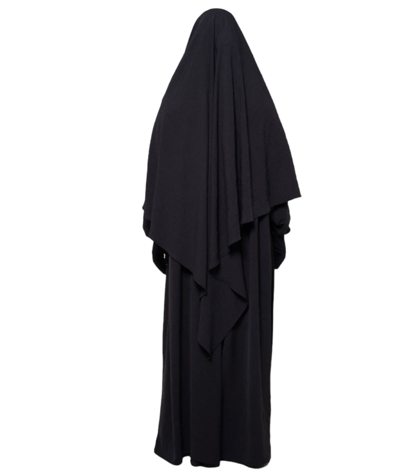 The Diamond Khimar is made from jazz crape fabric that sits comfortably around the face without slipping. It can be tied from the inside or outside, depending on what you prefer. It allows enough coverage for the front and back and is perfectly paired with the Princess Abaya.