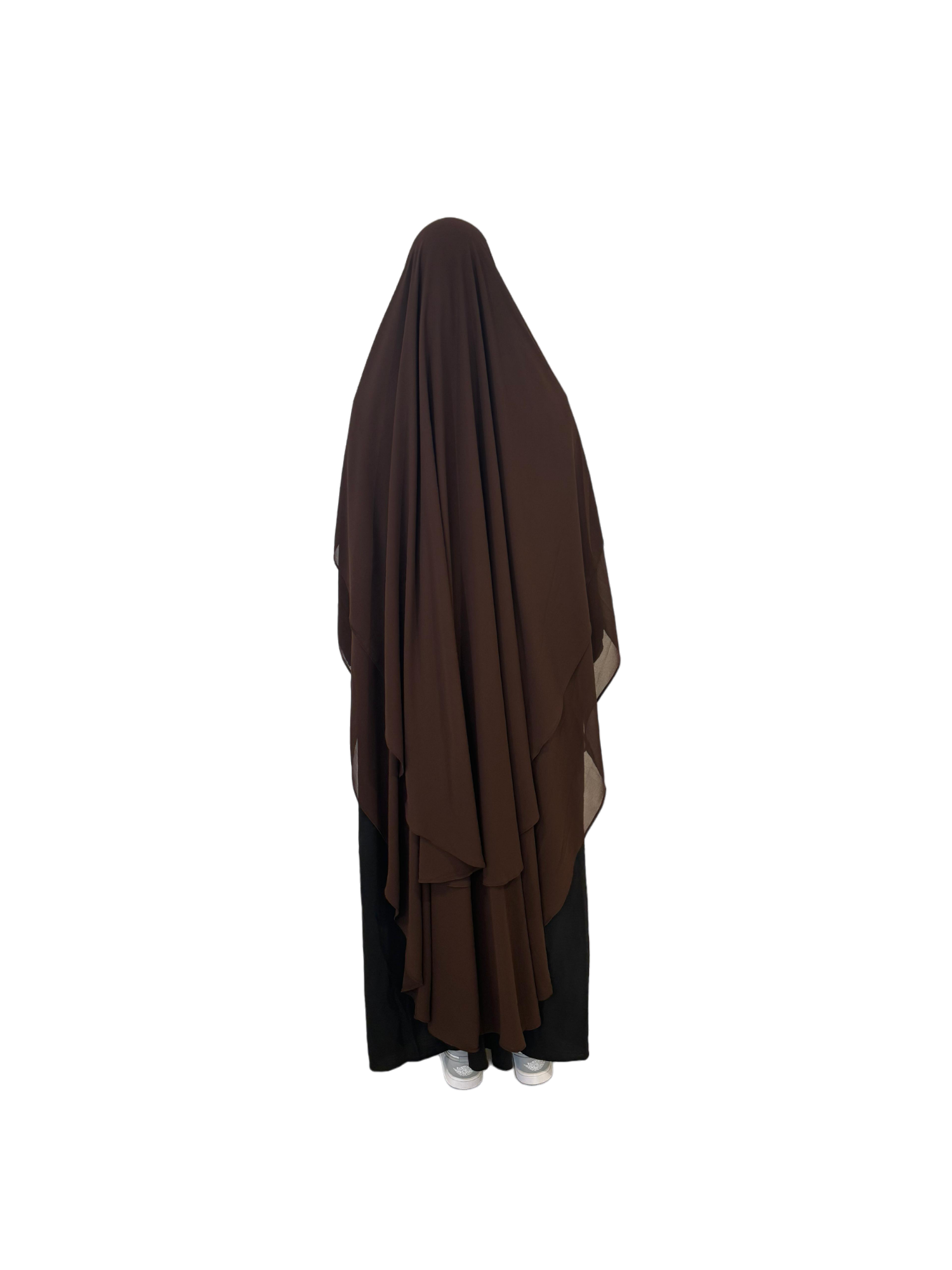 This is a long length 2 Layer Round Chiffon Khimar.The 2 layer chiffon Khimar is perfect if you love the layered princess style aesthetic. The khimar is made from 2 layers of chiffon it is not transparent but is still much lighter than a Jilbab. To secure the khimar there are 2 tie straps inside which you tie behind your head just as you would a jilbab. It also comes with niqab strings to cover your face or tighten the strings to adjust your chin area.