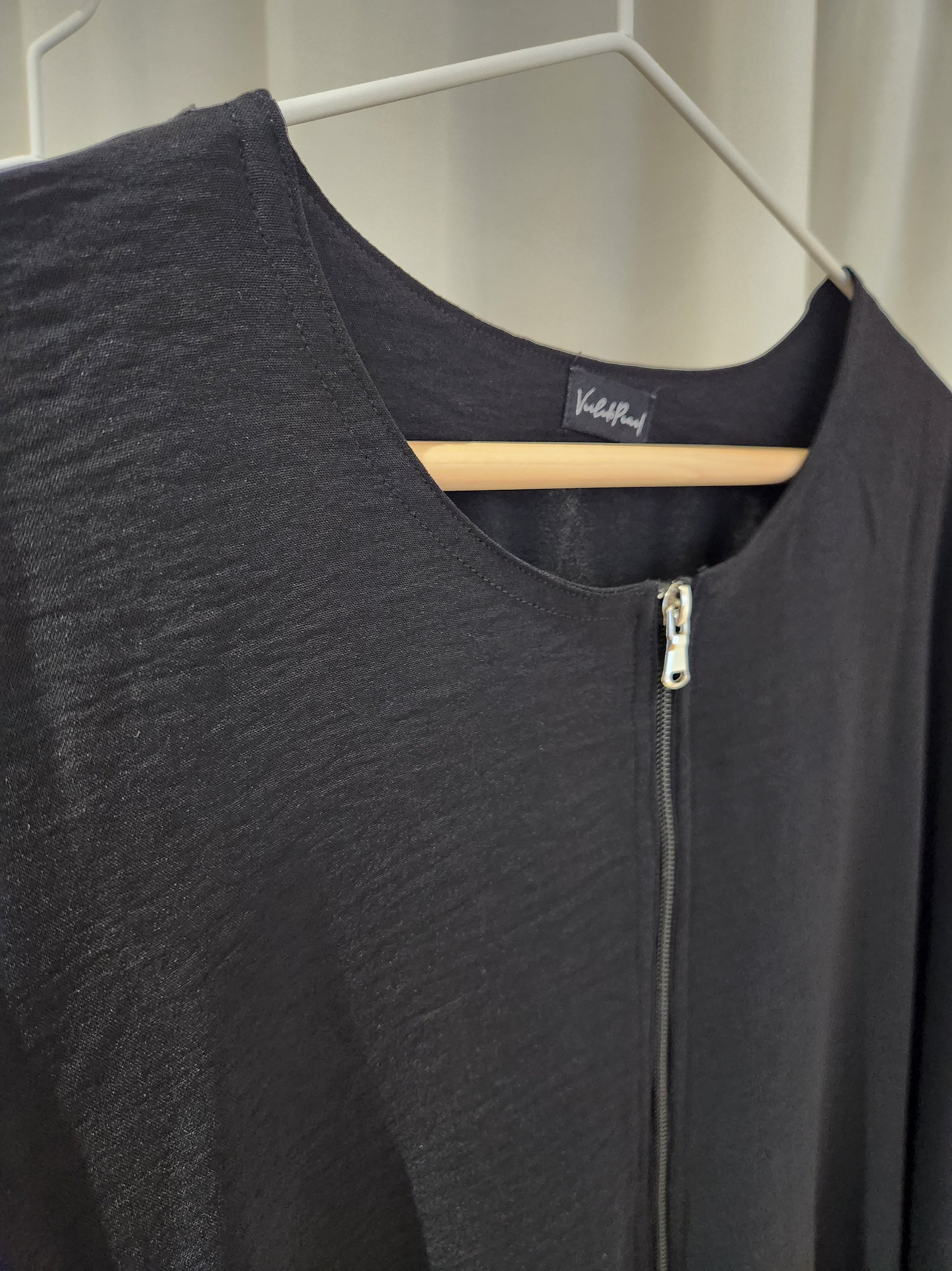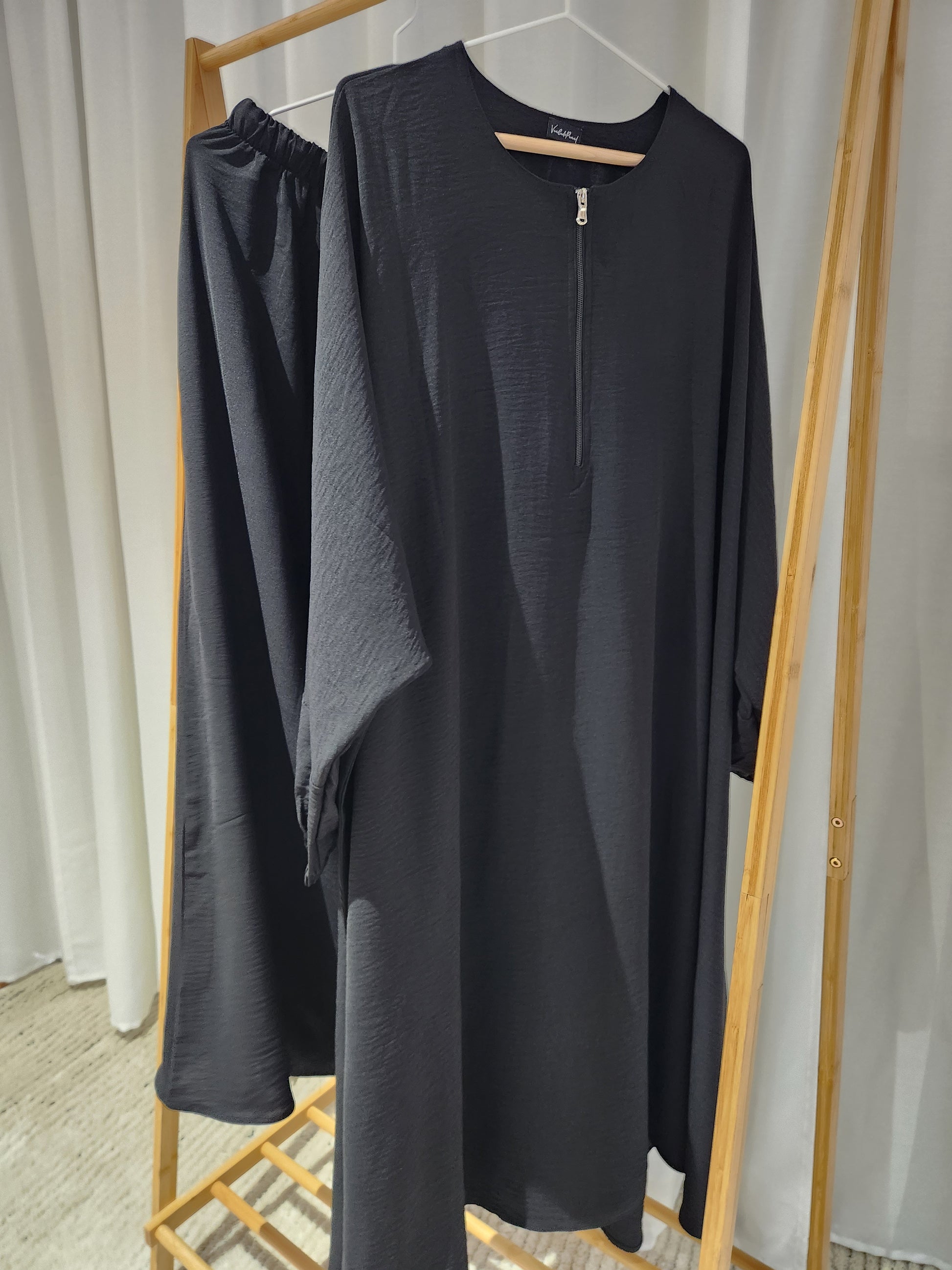 The second part of the Double Veil abaya is the long top that has the 25cm zip so it is practical for mothers. The sleeves are cuffed and come out similarly like a batwing so it is not fitted around the body but rather very loose. The material is jazz crepe and can be matched with the khimar colour to create a set or a colour of your choice.